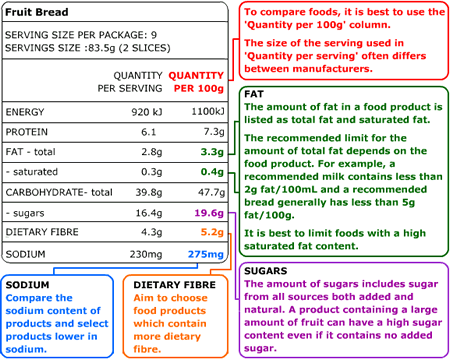The information on a food label (sample nutrition label below), can vary with each food product; it contains product-specific information (serving size, calories, and nutrient information). The bottom part (see #5 on the sample label below) contains a footnote with Daily Values (DVs) for 2,000 and 2,500 calorie diets. This footnote provides recommended dietary information for important nutrients, including fats, sodium and fiber. The footnote is found only on larger packages and does not change from product to product. In the following Nutrition Facts label we have colored certain sections to help you focus on those areas that will be explained in detail. You will not see these colors on the food labels on products you purchase.